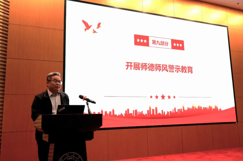 黄灿彬领学10月教职工理论学习相关内容并作师德师风警示教育,详细通报学术不端典型案例与违规违纪事件,剖析案例背后的问题根源,强调教师需坚守职业底线、恪守学术诚信,进一步强化全体教职工的职业规范意识与责任担当,为学院营造风清气正的育人环境筑牢思想根基。