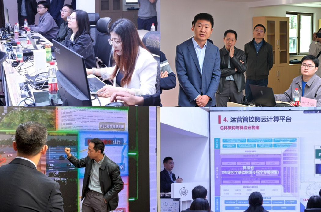 随后,项目组围绕“自主式交通系统”核心研究内容组织了系统平台现场演示。与会领导和专家乘车前往同济大学智能网联交通测评基地,实地检查了项目研发的算网一体化调度平台、车载协同计算装备、边缘计算装备与运营管控侧云计算平台,全面了解自主式交通系统的总体架构与关键技术实现。