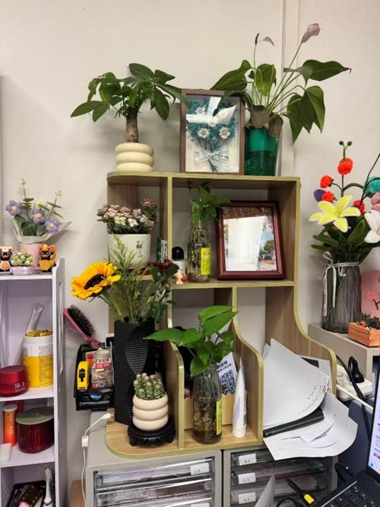 创作过程中,跨院系的老师们打破学科壁垒,不时交流技巧、分享心得。材料学院的老师向电信学院的同事请教多肉配土比例,医学院的老师则分享了鲜花保鲜的小窍门,“干花摆放要注意避开空调出风口,否则容易失水碎裂”、“多肉浇水要遵循‘见干见湿’原则,避免工位窗台积水”。欢声笑语在花香中流转。