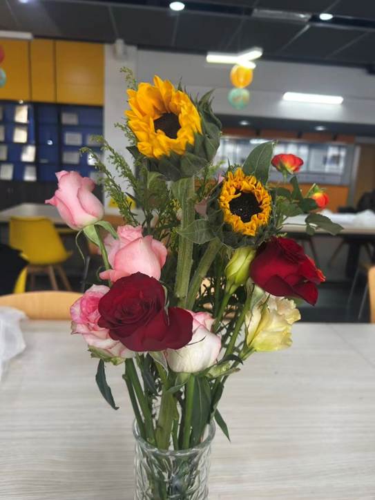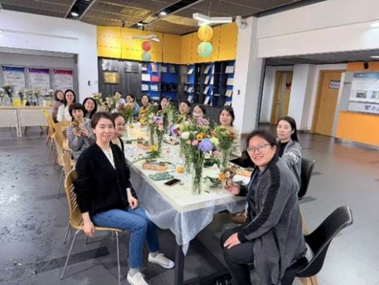经过一个多小时的创作,四十余件独具匠心的花艺作品新鲜出炉:清雅的鲜花花束、古朴的干花摆件、灵动的多肉盆栽,每一件都承载着创作者的巧思。老师们纷纷捧着作品拍照留念,镜头里,沾染花粉的指尖与映着绿意的笑靥相映成趣。活动尾声,大家带着亲手制作的花艺作品返程,不少人已开始规划工位摆放方案。