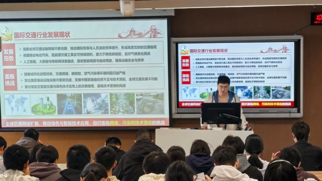 研究生第三党支部成员雷昊千重点分析国内外交通发展现状,指出全球交通正面临智能化、绿色化转型,也面临拥堵、污染等共同难题。我国交通基础设施规模世界领先,但也存在设施老化、运维压力大、区域不均衡等问题。他从智慧高速、自动驾驶、共享出行、新能源汽车等方面总结行业机遇,并提出从规划统筹、法规完善、科技创新和公众参与等方面推动治理现代化。要在挑战中把握变革窗口期,推动交通事业高质量发展。