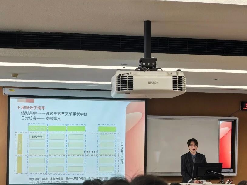 本科生第三党支部书记胡志超老师围绕入党积极分子培养教育工作进行系统讲解,详细阐述了积极分子培养流程、与研究生党员“结对共学”机制,以及支部党员在日常培养中的具体要求与工作安排,为后续本科新生入党积极分子的培养发展提供了有力指导。