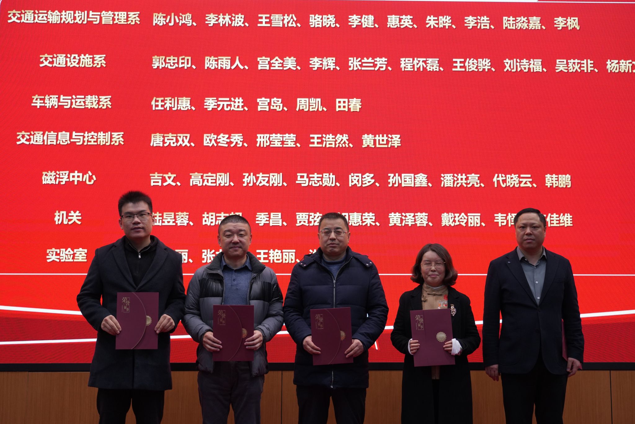 从左至右:交通运输规划与管理系主任孙剑、交通设施系主任钱劲松、车辆与载运系副主任李莉、交通信息与控制系副主任沈煜、国家磁浮交通工程技术研究中心主任徐俊起