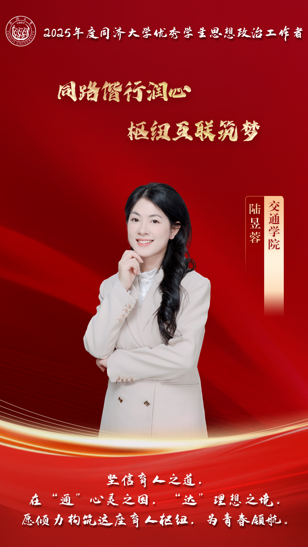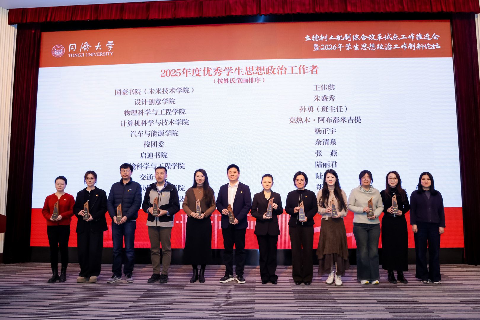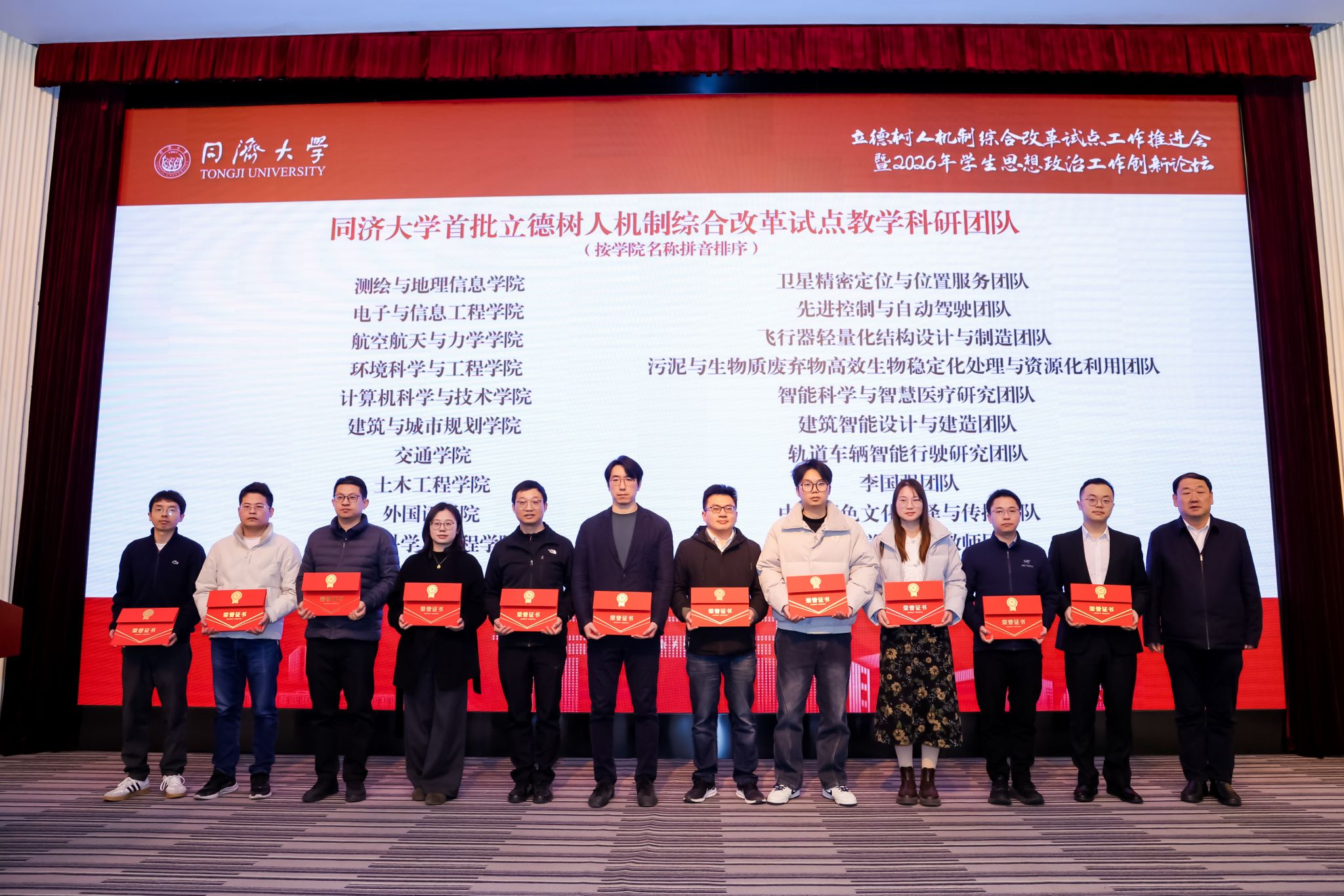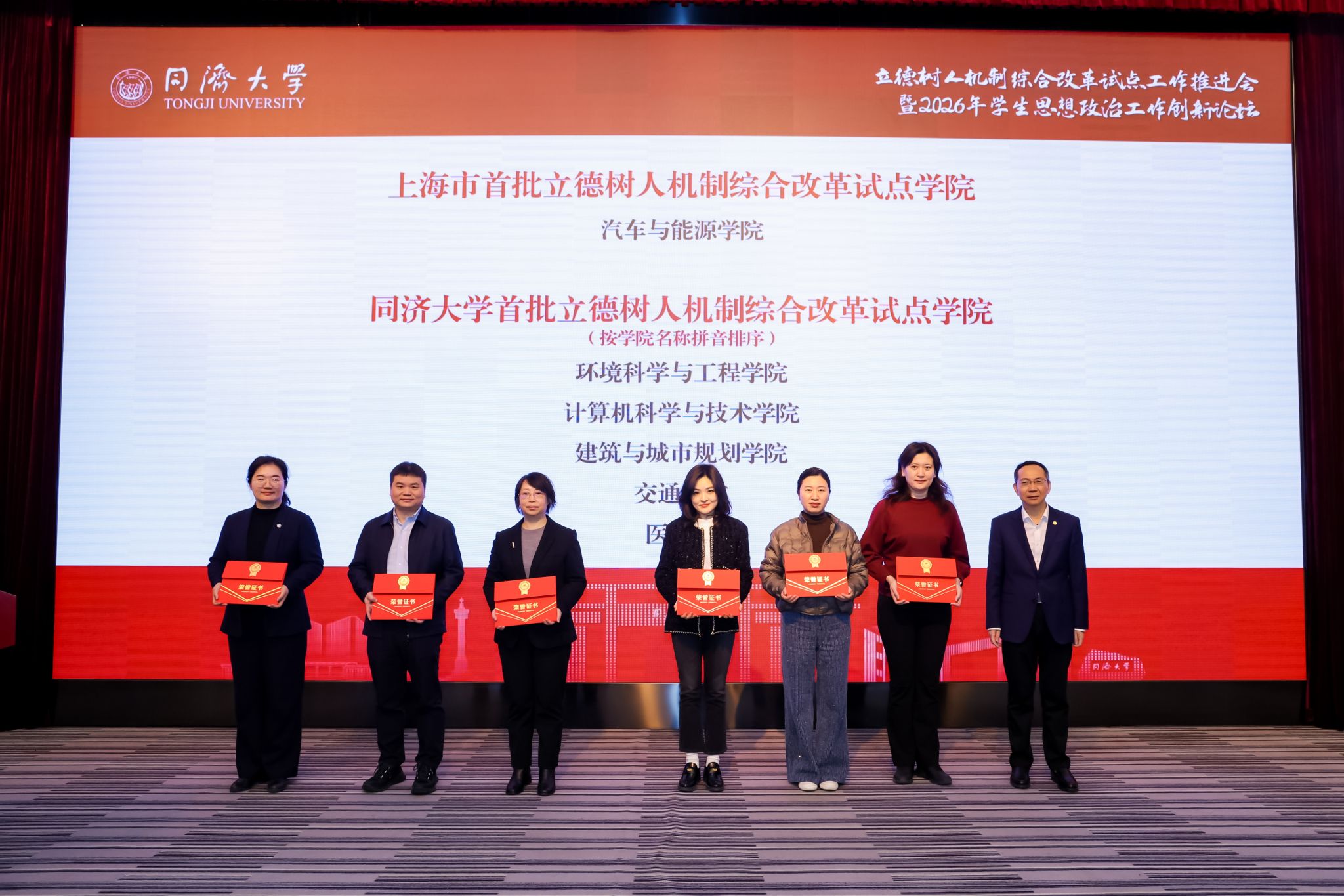 为深入学习贯彻党的二十大精神,全面落实立德树人根本任务,持续推动学生思想政治工作高质量发展,1月15日,同济大学立德树人机制综合改革试点工作推进会暨2026年学生思想政治工作创新论坛在四平路校区成功举行。大会表彰中,交通学院成功入选“同济大学首批立德树人机制综合改革试点学院”,并获评“同济大学2025年度学生工作考核优秀状态学院”;轨道车辆智能行驶研究团队成功入选“同济大学首批立德树人机制综合改革试点教学科研团队”,城市交通班成功入选“同济大学首批立德树人机制综合改革试点班级”,陆昱蓉老师荣获“2025年度优秀学生思想政治工作者”。