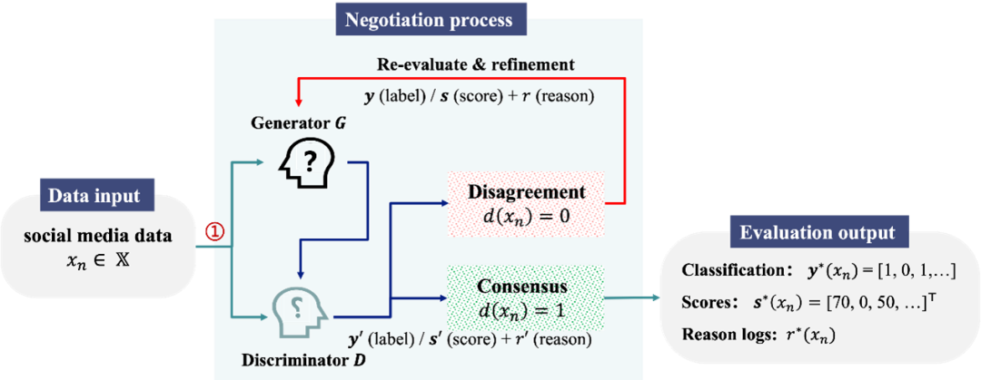 本研究提出的大模型协商评价机制,涉及两个LLM参与者:生成器输出评价结果,判别器评估输出的质量并提供反馈以供改进,具体协商过程示意见下图。生成器先输出数据的评价指标分类、主观体验得分和原因,判别器则对输出进行检查和判断。如果未能达成共识,判别器将向生成器提出关于评价结果的修改建议和理由,以便进一步协商讨论。直到二者达成共识,生成器的答案将被采纳作为结果。