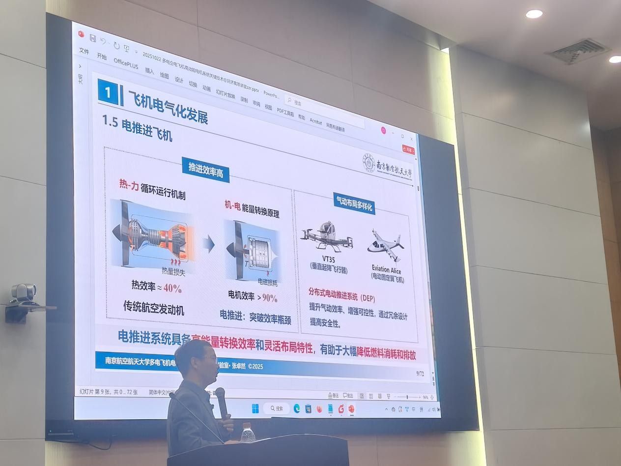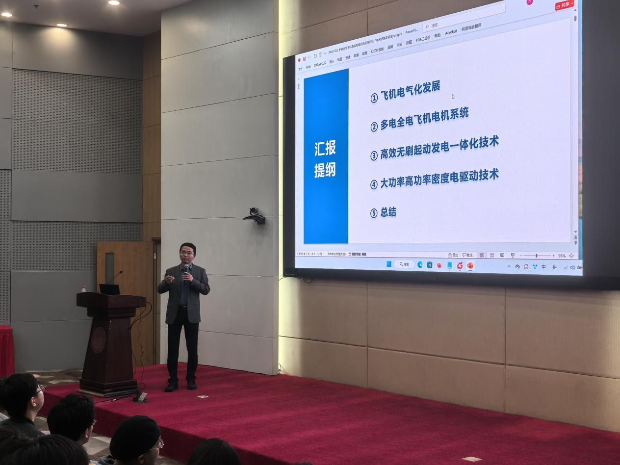 在讲座上,张教授指出,多电全电化正成为新一代飞机发展的重要方向。机载二次能源乃至动力系统的电气化,是实现绿色航空、降低油耗与排放、提升维护与可靠性的关键路径;高效能电机及其控制系统是支撑这一变革的核心基础。报告从多电全电飞机的基本概念与技术脉络切入,强调航空电机系统在功率密度、效率、可靠性、热管理与电磁兼容等方面的严苛要求,并结合团队工程实践介绍从“起—发”一体化到推进电驱的最新进展与体会。