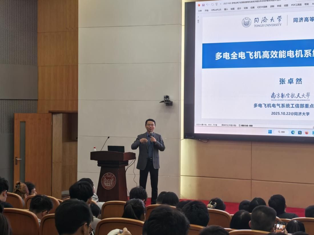 2025年10月22日18:25,由交通学院举办的同济高等讲堂在济人楼312室成功举办。本次论坛特别邀请了来自南京航空航天大学的张卓然教授为主讲,就“多电全电飞机高效能电机系统关键技术研究”主题进行分享。