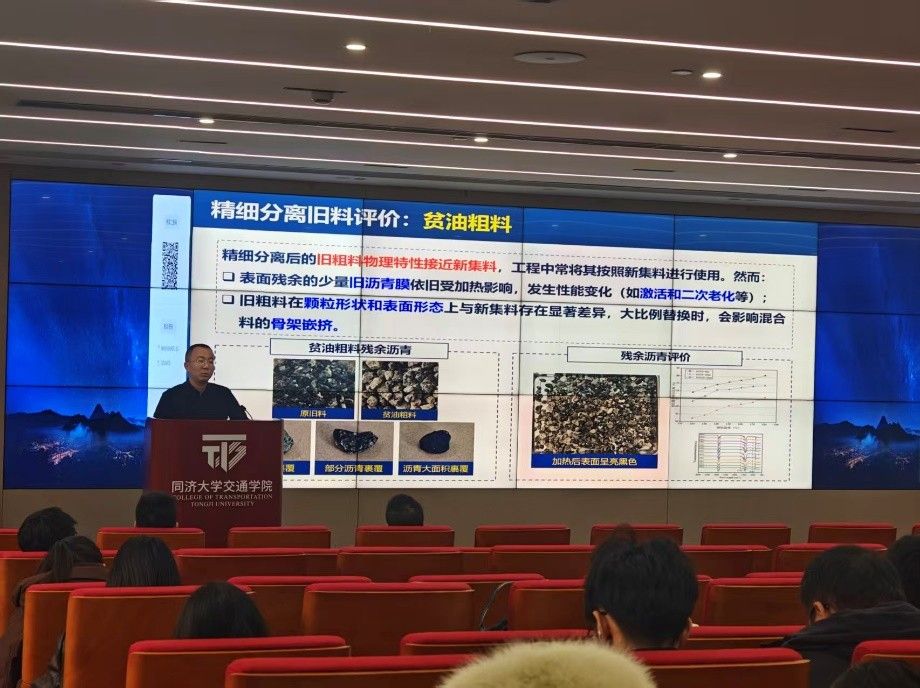 接着张教授重点阐述了旧料精细分离技术的核心逻辑与应用价值——通过该技术可实现不同老化程度的沥青与旧集料的精准剥离,从而打破传统再生材料掺量的限制,让精细分离后的再生材料能更高比例地替代新料;同时还讲解了高旧料掺量、适配多工程场景的不同类型混合料的研发方向,通过这类混合料的落地应用,可推动精细分离再生材料的多元化高效利用,达到高品质再生的目的。