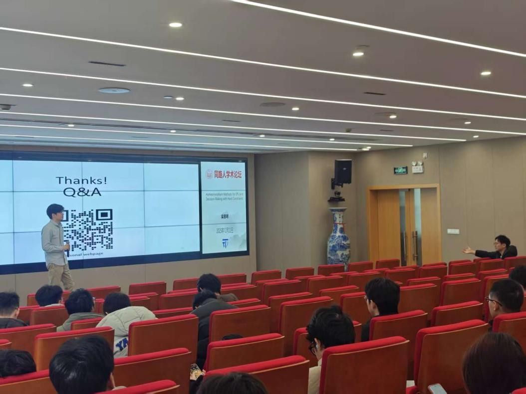 讲座尾声,梁恩明教授与现场同学展开了互动交流。针对 “同胚方法在非凸场景中的泛化性”“算法落地时的硬件资源需求” 等具体问题,他结合实验细节逐一解答,并给出了 “先从小规模场景验证方法、再逐步拓展至实际系统” 的实操建议,现场讨论氛围热烈。本次论坛为相关领域研究者提供了硬约束决策优化的新方法思路,助力大家在学术研究与工程应用中更高效地应用。