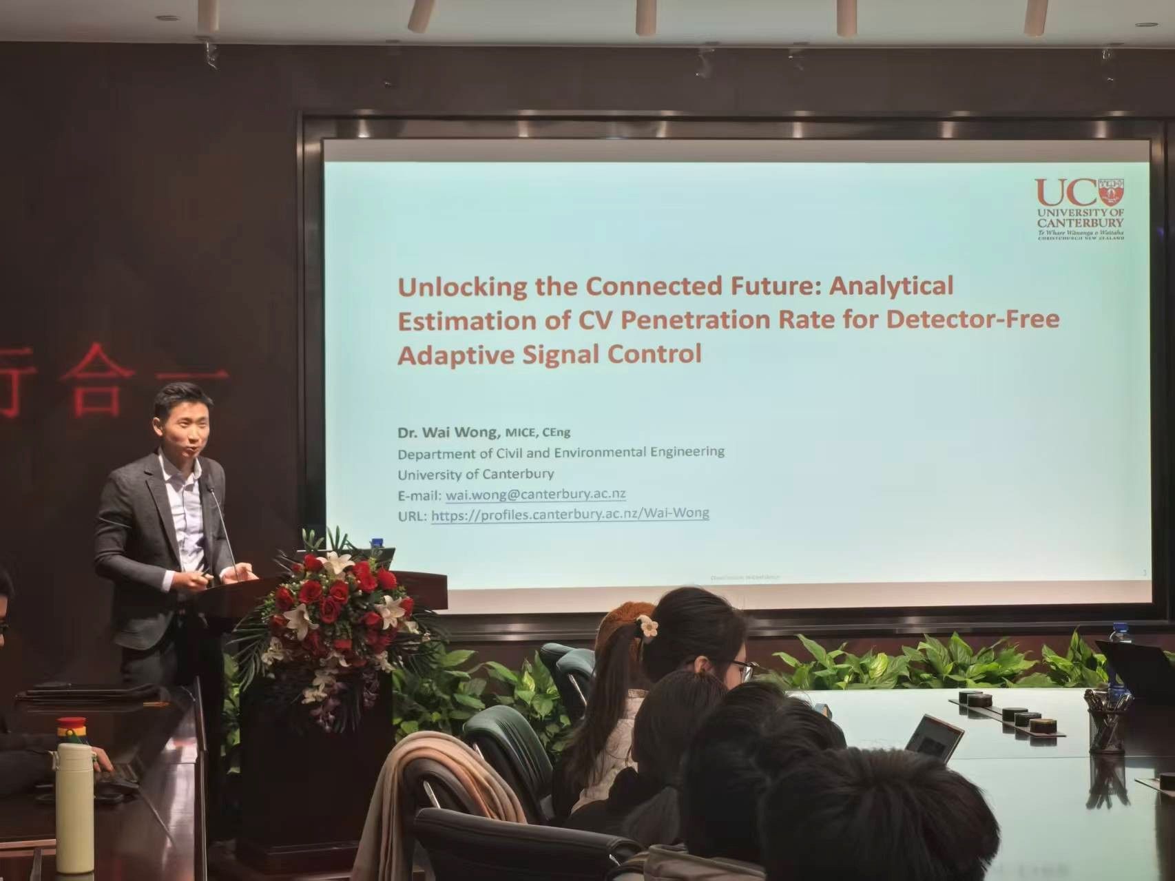2025年12月26日下午15:30,由同济大学交通学院举办的同路人学术论坛在通达馆102会议室成功举办。本次论坛邀请到新西兰坎特伯雷大学土木与环境工程系高级讲师Dr. Wai Wong,就“Unlocking the Connected Future: Analytical Estimation of CV Penetration Rate for Detector-Free Adaptive Signal Control”主题进行了精彩分享。