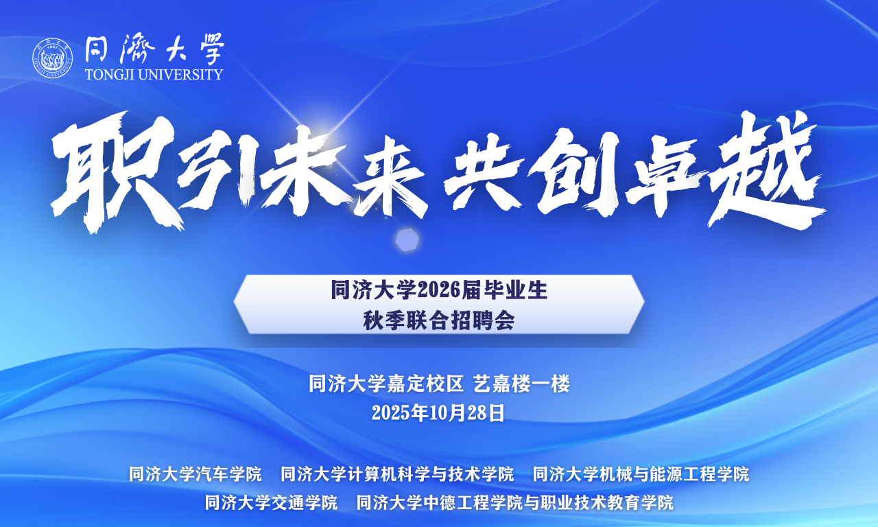 衷心感谢贵单位长期以来对同济大学毕业生就业工作的关心与支持!为进一步推进毕业生高质量就业、搭建高效便捷的校企对接平台,同济大学交通学院、汽车学院、计算机科学与技术学院、机械与能源工程学院、中德工程学院与职业技术教育学院,以资源整合优化、学科交叉融合、优势互补共享为导向,定于2025年10月28日(周二)13:30-16:00于同济大学嘉定校区艺嘉楼一楼举办2026届毕业生秋季联合招聘会。本次招聘会主要面向2026届全日制毕业生,欢迎有招聘需求的单位联系咨询。诚挚邀请贵单位莅临参加本次招聘会,与学生充分沟通交流,选聘英才!